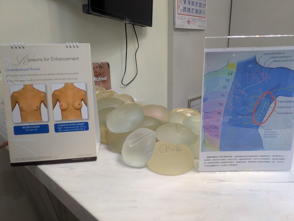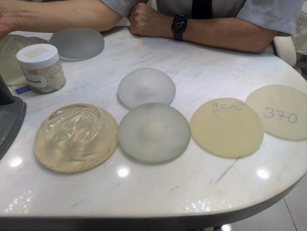 たくさんの豊胸バッグが置かれたデスクから、最新のものや機能や価格面から好まれているものなど教えていただき、表面がツルツルしているものとザラザラしているものの違いなど、細かなことも丁寧に解説してくださいました。