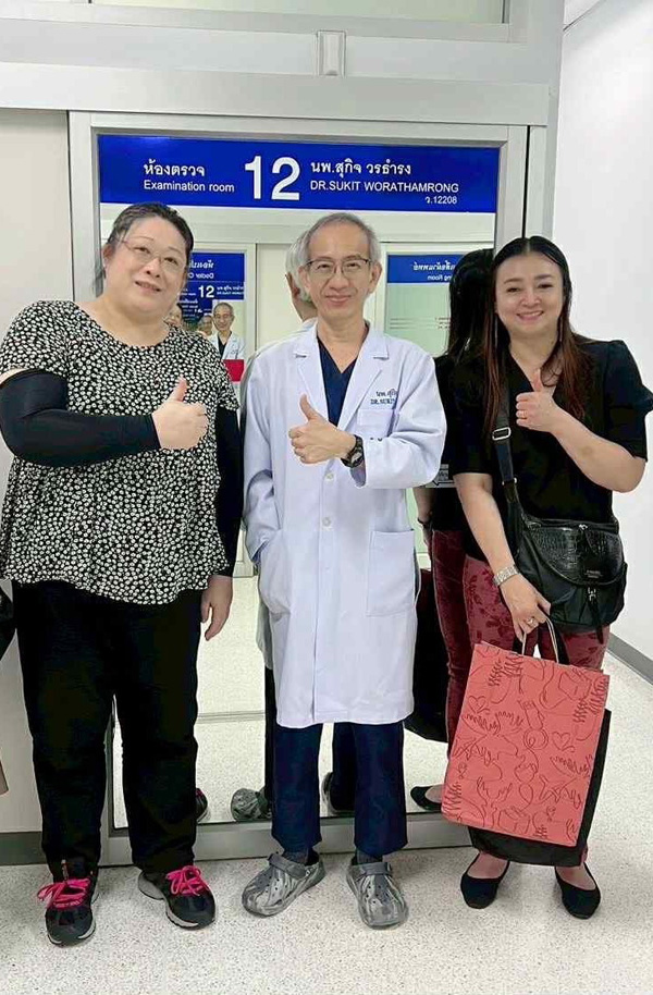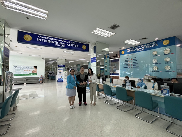 写真は、外国人受け付けカウンターにて、国際部責任者のナイパ先生の秘書をされているパットさんと、同じく国際部に所属をしている日本語堪能なトゥーンさんとのスリーショットです。