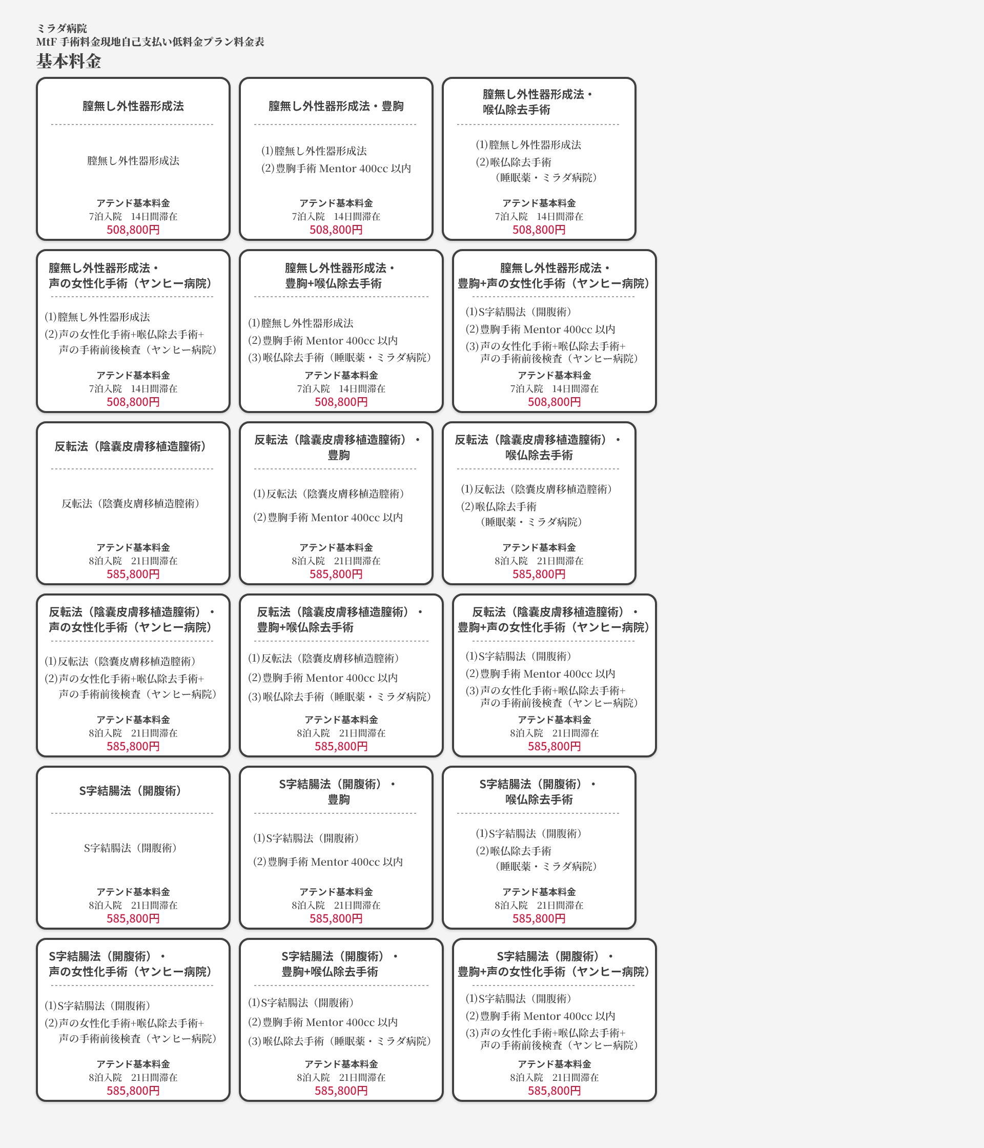 アクアビューティプランの詳細は、こちらをご覧ください。MtF手術料金現地自己支払い 低料金プラン